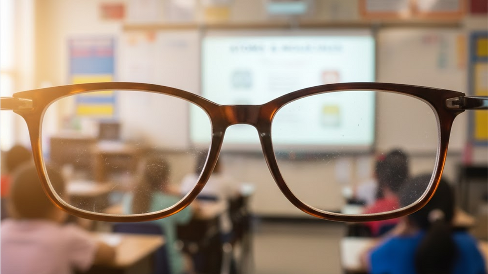 The view settles. Books, whiteboards, pencils, and screens fill the day. The glasses stay on for long stretches as the child looks up, down, and forward again and again.